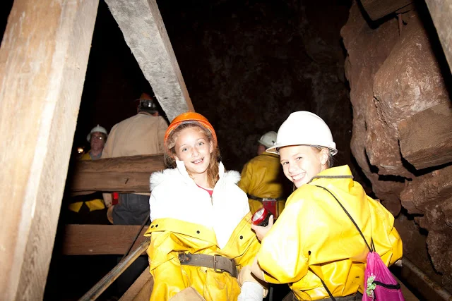 Before beginning the tour they outfit you in jackets, helmets, and a belt which they hang a light which is hooked to a battery pack on the back of your belt. Now we were ready to enter the mine. It was 47 degrees in there!
